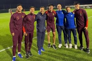 赛后,前广州球员刘殿座、韦世豪、吴少聪、高准翼与前广州主帅卡纳瓦罗合影留念,昔日师徒再聚首,5人曾一起夺得2019年中超冠军。
