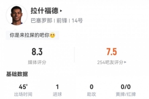 体育资讯2月1日讯 本轮西甲,巴萨3-1客胜埃尔切。此役拉什福德替补出场45分钟,球员全场重点数据如下↓