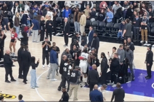 赛后,哈登被媒体记者们包围,他和自己的几个朋友拥抱致意。