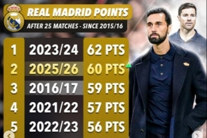 体育资讯2月17日讯 数据网站Score90盘点了自2015/16赛季以来,皇马在西甲前25轮过后同期积分情况,其中本赛季60分位居次席,具体如下: