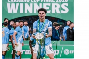 曼城官方社媒晒出奥赖利捧杯的照片,配文:“周六庆祝自己的21岁生日,周日为儿时的俱乐部将温布利染成蓝色,奥赖利的完美周末。”
