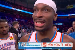 本场比赛,亚历山大出战41分钟,投篮19中12,三分3中2,罚球25中21,拿到47分5篮板3助攻2抢断。