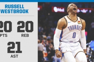 神迹!2019年的今天:威少砍下20+20+20史诗级三双 比肩张伯伦