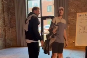 视频当中,东契奇将里夫斯的真人等高纸板一把推倒,随后分别进行高尔夫推杆尝试但均未成功,两人也不忘互损一番。