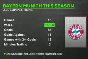 数据统计显示,拜仁在本赛季各项赛事16战保持全胜,打进56球、丢11球。有13场比赛能够至少打进3球,本赛季共计仅有5分钟处于落后。