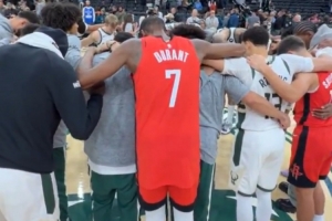 GIF-赛后杜兰特、谢泼德、阿门“加入”雄鹿祈祷圈