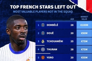 体育资讯11月14日讯 德国转会市场统计了无缘本期法国队名单球员的身价,并列出榜单,登贝莱1亿欧居首。