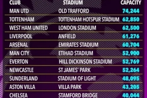 除了今夏搬进新球场的埃弗顿之外(主场容量从39414人增至52769人),英超还有5家俱乐部的球场容量在新赛季发生了变化。