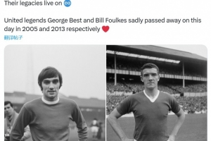 体育资讯11月25日讯 曼联官方发文,纪念在11月25日离世的乔治·贝斯特以及比尔·福克斯。