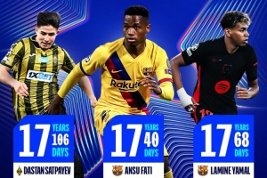 欧冠官方晒出最年轻进球者前三海报,其中法蒂以17零40天成为欧冠最年轻进球者,其次是17岁零68天的亚马尔,排名第三正是萨特帕耶夫。