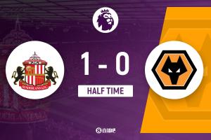 上半场比赛结束,桑德兰1-0狼队。