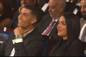 这句话引得台下的C罗露出满脸笑容,他身旁的乔治娜也微笑鼓掌。