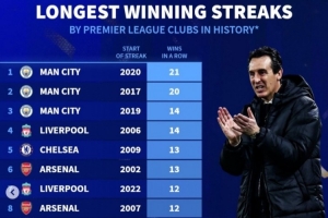 英超球队历史各项赛事最长连胜榜:曼城21场居首,维拉当前11连胜