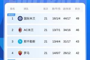 体育资讯01月19日讯 本轮意甲,米兰1-0莱切,罗马2-0都灵,积分榜最新情况如上图。